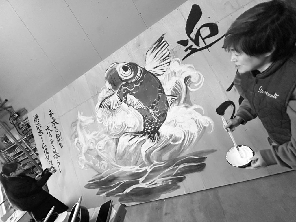 絵のなかで勢いよく飛び上がる錦鯉は、実際に会社の池で泳いでいる本物をそのまま描いてくれていて、その躍動感に思わず見入ってしまったほど。